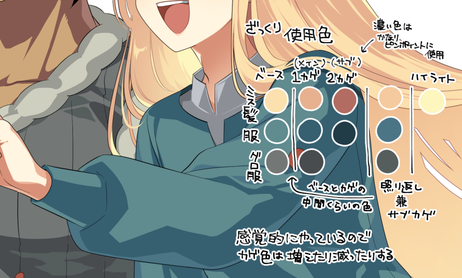 髪や瞳など印象的なパーツは色数増やしたり差し色入れたりして、服などは控えめにするといいかなと思います